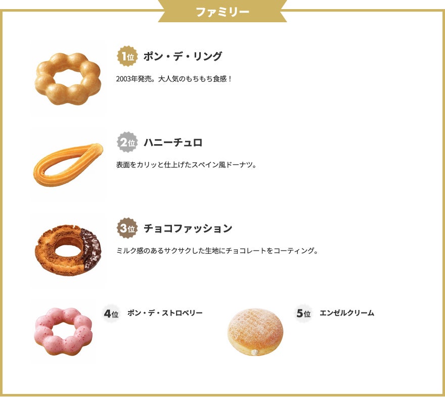 また、ファミリーの4位には、いちごミルク風味の「ポン・デ・ストロベリー」がランクイン。5位には「エンゼルクリーム」がランクインしました。創業当初から愛され続けているミスタードーナツの定番ドーナツです。