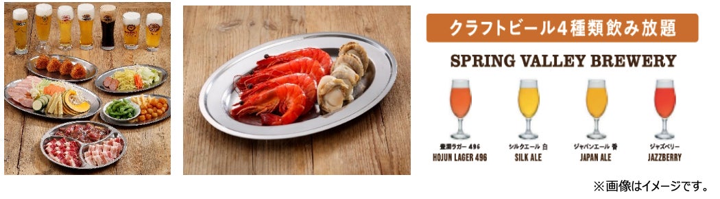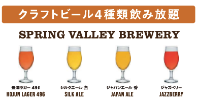 飲み放題メニューには7種類の生ビールに加えて、4種類のクラフトビール(豊潤ラガー496、シルクエール白、JAPANエール香、ジャズベリー)が飲み放題に。よりグレードアップしたお料理、ドリンクでビアガーデンをお楽しみいただけます!