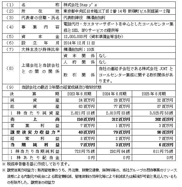Step y’s社は、電話代行・カスタマーサポートを中心としたコールセンター業務、SES、BPOサービスの提供のほか、エステ事業およびレストラン事業を営んでおりますが、本件株式取得の対象はこれらエステ事業およびレストラン事業を除く事業であります。