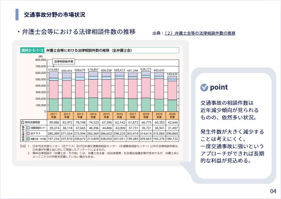 交通事故分野の魅力は、市場規模が安定して大きく、案件の処理も一定のパターンがあるため、