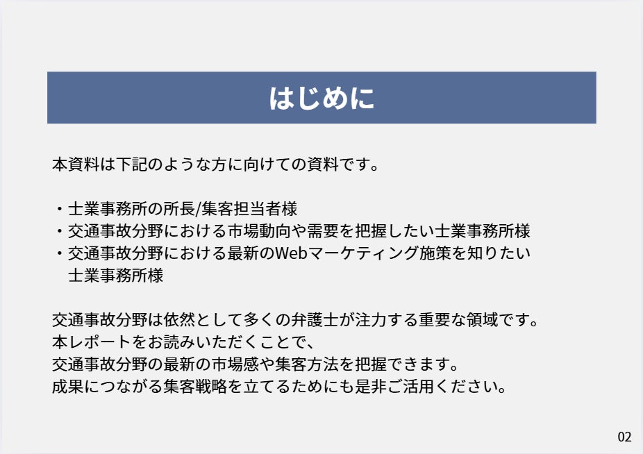 本資料では、これまで多数の士業事務所様や大手法律事務所へのマーケティング支援を通じて