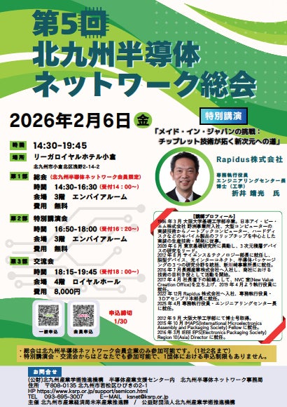 Rapidus株式会社専務執行役員・エンジニアリングセンター長である折井靖光氏を講師にお迎えした特別講演会、さらに市域企業を中心に158社が加入する「北九州半導体ネットワーク」との交流会に是非注目!