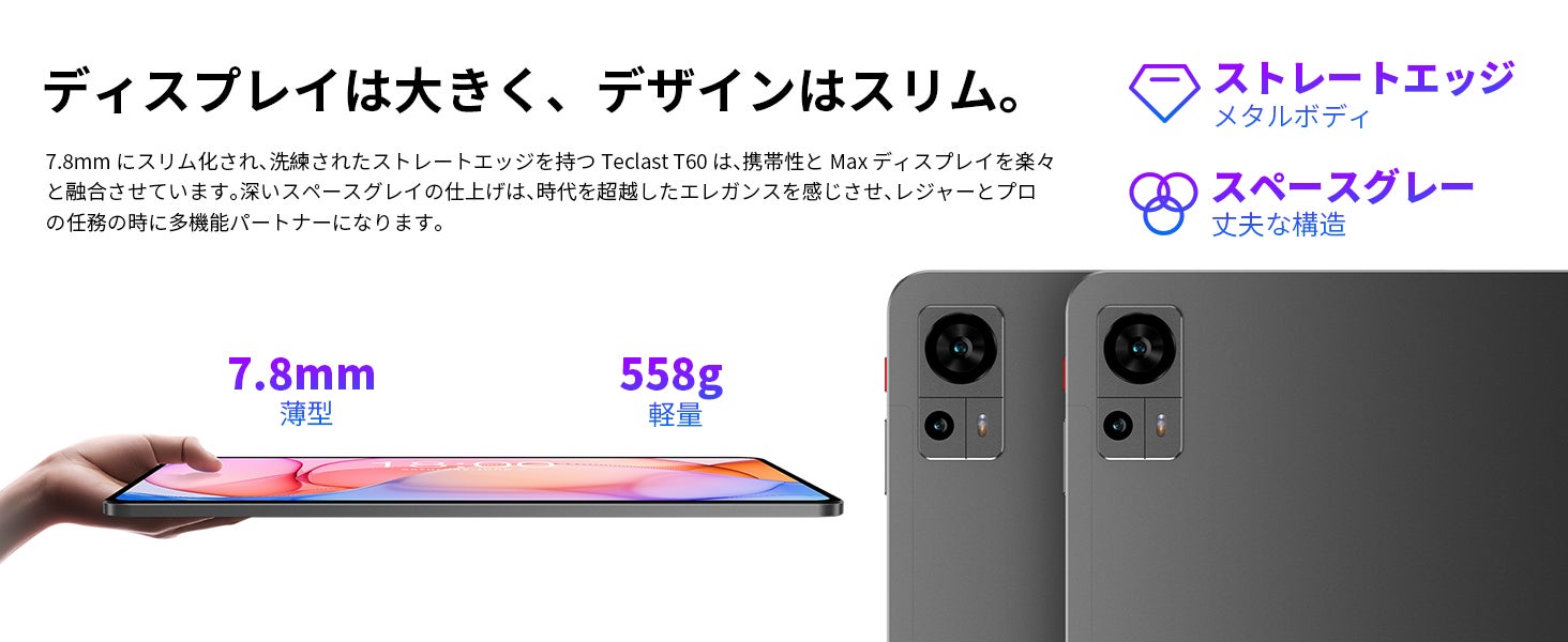 Teclast「T60」の12インチディスプレイは、明快さとエレガンスを兼ね備えています。洗練された6.5mmの額縁取られ、92%のスクリーン対ボディ比を誇り、鮮明で没入感のある視聴体験を提供します。先進のTDDIタッチスクリーン技術を採用しています。120Hzのタッチサンプリングレートと複雑な82チャンネルのタッチマトリックスとの組み合わせにより、シームレスで直感的なタッチ体験を提供します。