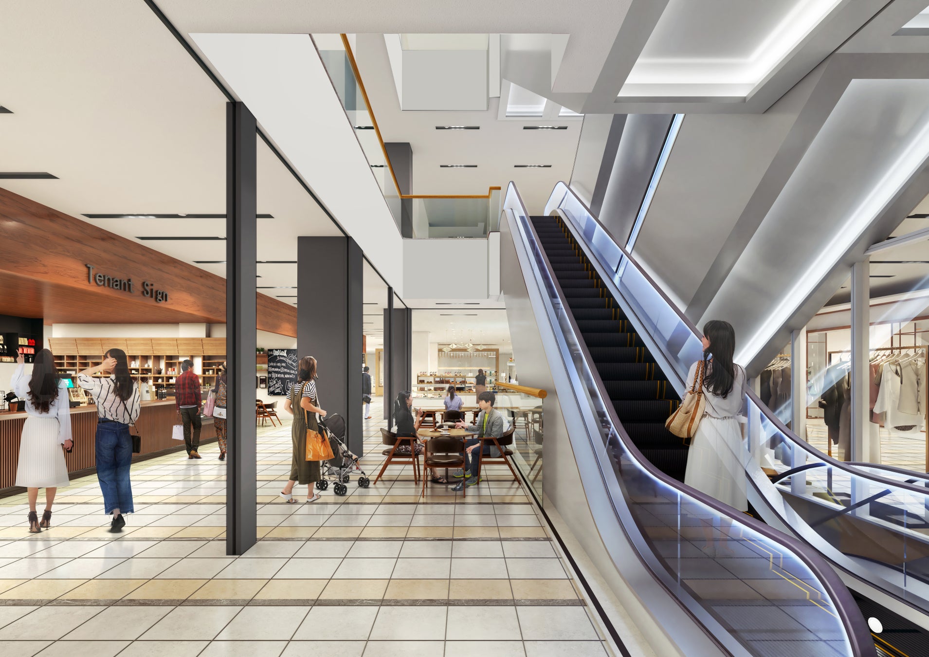 施設中央のエスカレーターを中心に柱型のデザインを統一。