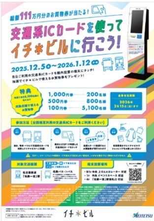 期間内に対象の駅、バスを利用した交通系ICカードを施設内の設置端末にタッチすると、抽選で6,100名様に施設内の対象店舗で使える最大1,000円分のお買い物券が当たります!