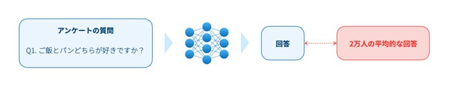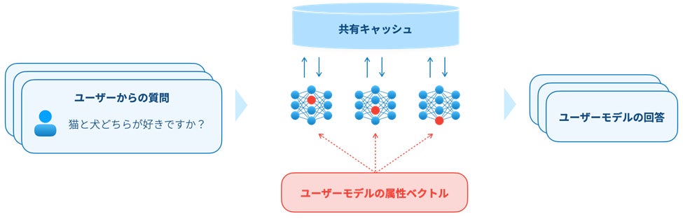本技術は、バイアスの影響を抑えるように学習したパラメーター(属性ベクトル)でユーザーモデルを生成し、さらに数千〜数万の質問を大量に並列実行した結果を統計的にまとめることで、LLMが内包するバイアスを取り除き、精度と信頼性の高い回答を取得します。
