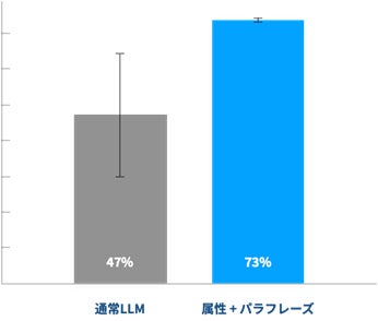 実験の結果、通常のLLMを用いた場合、最小30%、最大65%と正答率が安定しなかった結果に対し、属性ベクトルを与えた上で質問をパラフレーズ(質問の順序入れ替えなど)した本技術において73%の安定した正答率の結果となり、技術の有効性を確認しました。