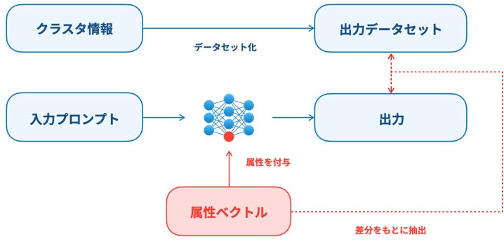 ユーザーモデル生成においては、匿名化された企業固有のデータをさらに多段階のクラスタリングで統計化したクラスタ情報をもとに出力データセットを生成し、属性ベクトルの抽出に利用します。属性ベクトルをLLMに加えることで、さまざまな属性(性格、価値観、考え方など)の付与が可能となり、この属性をユーザーモデルのプロファイルとして利用します。