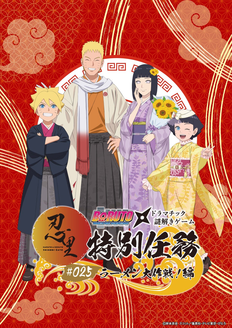 『NARUTO-ナルト-』『BORUTO-ボルト- NARUTO NEXT GENERATIONS』のキャラクターたちのオリジナルストーリーを体験しながら、謎解きゲームに挑戦する 特別イベントの第25弾。今回の特別任務は、『BORUTO-ボルト- NARUTO NEXT GENERATIONS』の世界をベースに、うずまきナルト一家4人のオリジナルストーリーを体験することができます。家族の絆を体験しながら、謎解きゲームに挑戦しましょう。任務に参加された方には、書下ろしキャラクターのオリジナルアクリルキーホルダーをランダムで1つプレゼントいたします