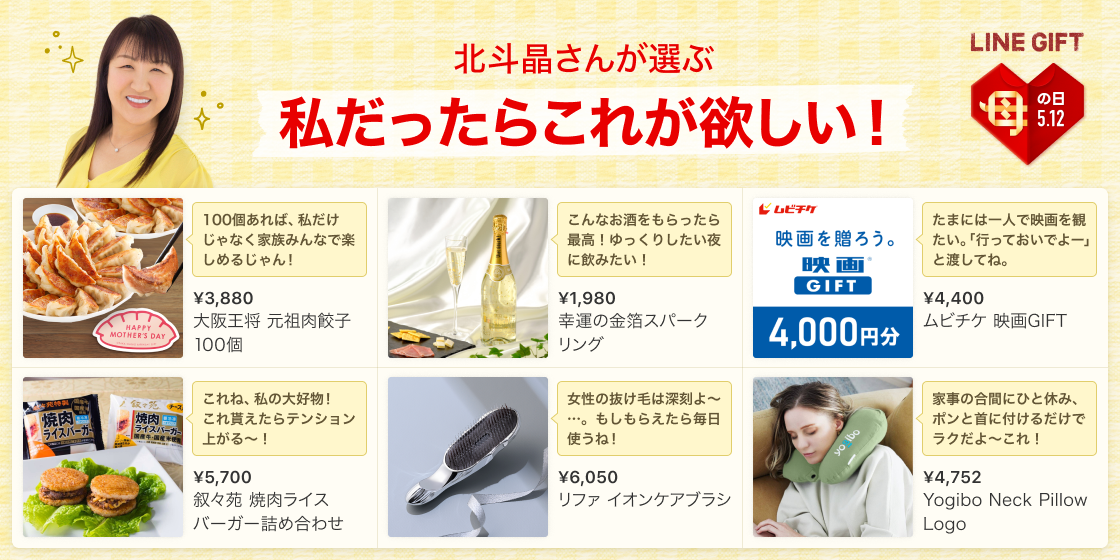母の日には「息子たちはちゃんと覚えてるかな?」とドキドキしつつ、2人の母には「何を贈ろうか?」と悩む立場でもある北斗晶さん。「“お母さんのために”って選んでくれたやつには、ガツンとくるもんがあるのよね。心がジワッと温まる母の日にもらえたら嬉しいなって思ったアイテムを選んでみたよ!」と話す北斗晶さんの厳選商品は、毎日使えるヘアケアグッズ、リフレッシュタイムにぴったりの映画チケットやスパークリングワイン、家族でも楽しめる肉餃子100個や焼肉ライスバーガーなど。北斗晶さんお墨付きの商品は、母の日のギフト選びに悩む方必見です。