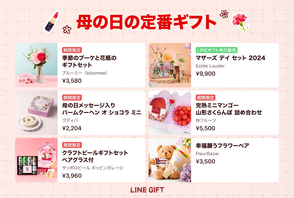 昨年の母の日は、「LINEギフト」の1日における流通額の過去最多※1を記録しており、離れていてもお母さんに感謝の気持ちを伝えられ、当日でも贈れる「LINEギフト」は、母の日に多く活用されています。