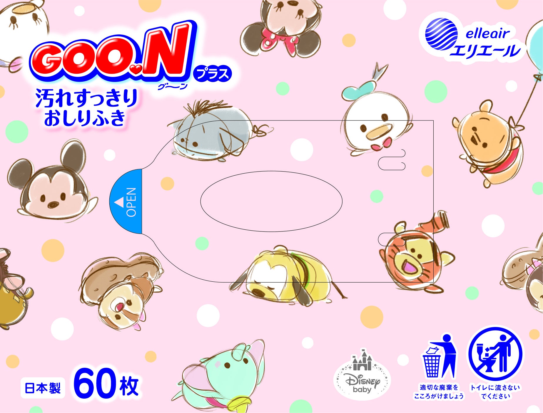 新商品『グーンプラス 汚れすっきりおしりふき』は、当社のおしりふきとしては初めて乳液成分を配合したことに加え、表面に凹凸のある厚手のぽこぽこシートを採用することで汚れ落ちをアップさせ、しつこいうんち汚れをしっかりふきとります。赤ちゃんの繊細な肌へのやさしさを考え、シアバター、グリセリン、ヒアルロン酸を配合。ノンアルコール、無香料、防腐剤のパラベン無配合で、おしりふき用の他、手やからだにもお使いいただけます。パッケージデザインには、人気のディズニーツムツムデザインを採用し、ミッキーマウスやミニーマウス、くまのプーさんなど愛らしいキャラクターと一緒に、おむつ替えの時間を楽しく彩ります。
