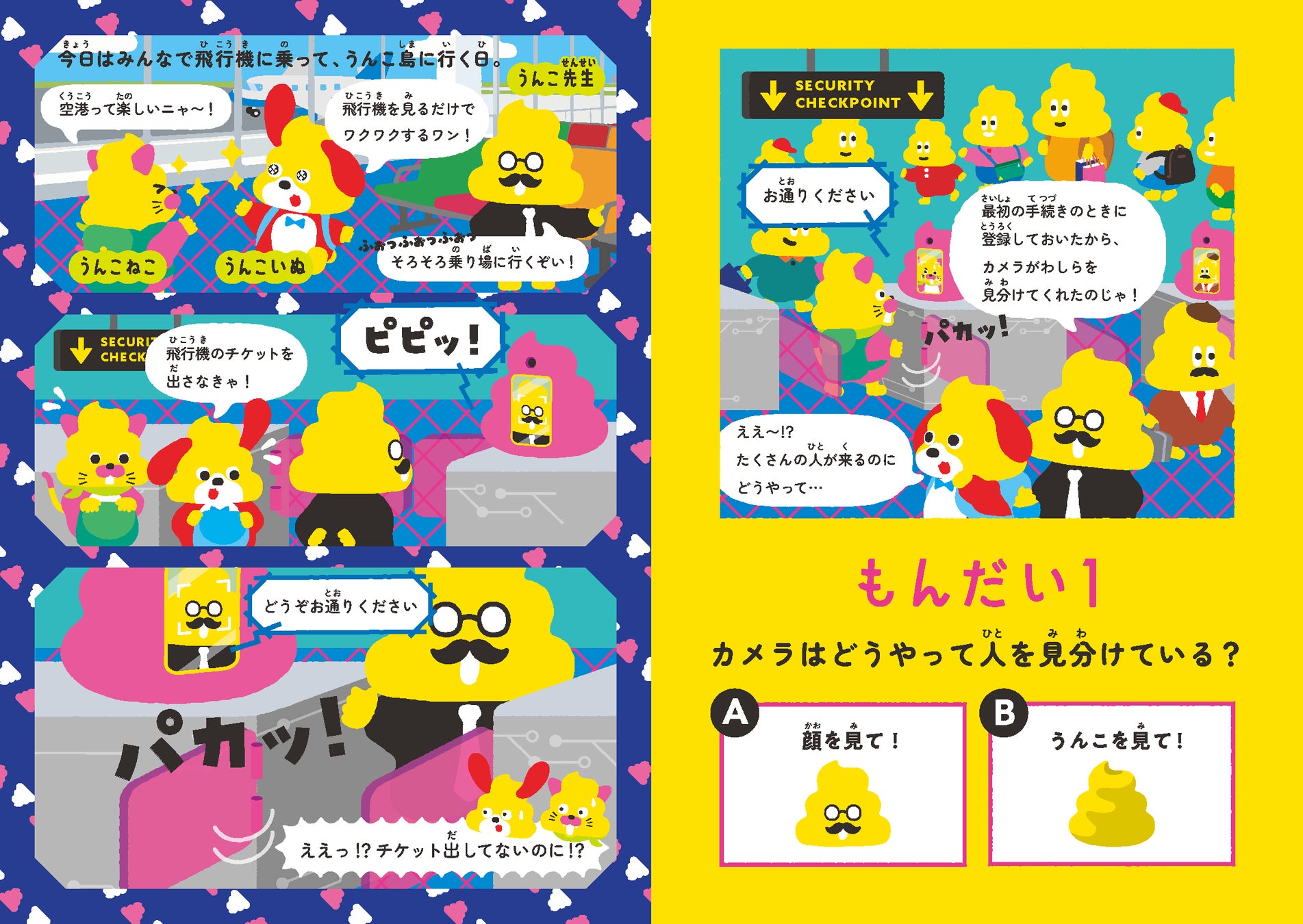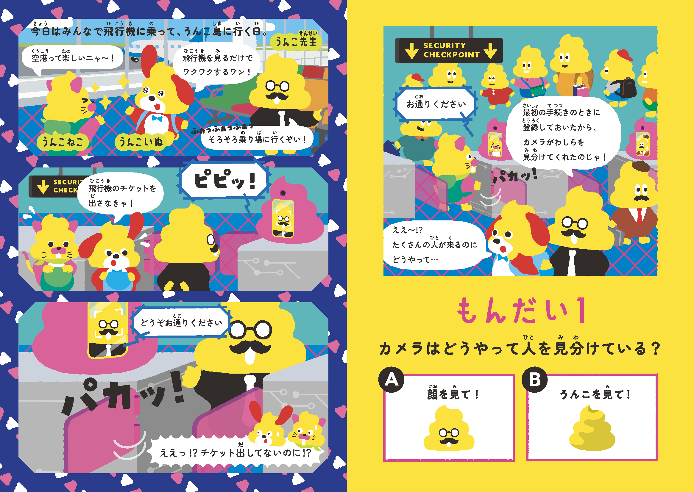 物語は、うんこ先生とうんこねこ、うんこいぬが飛行機に乗るため空港へ向かう場面から始まります。