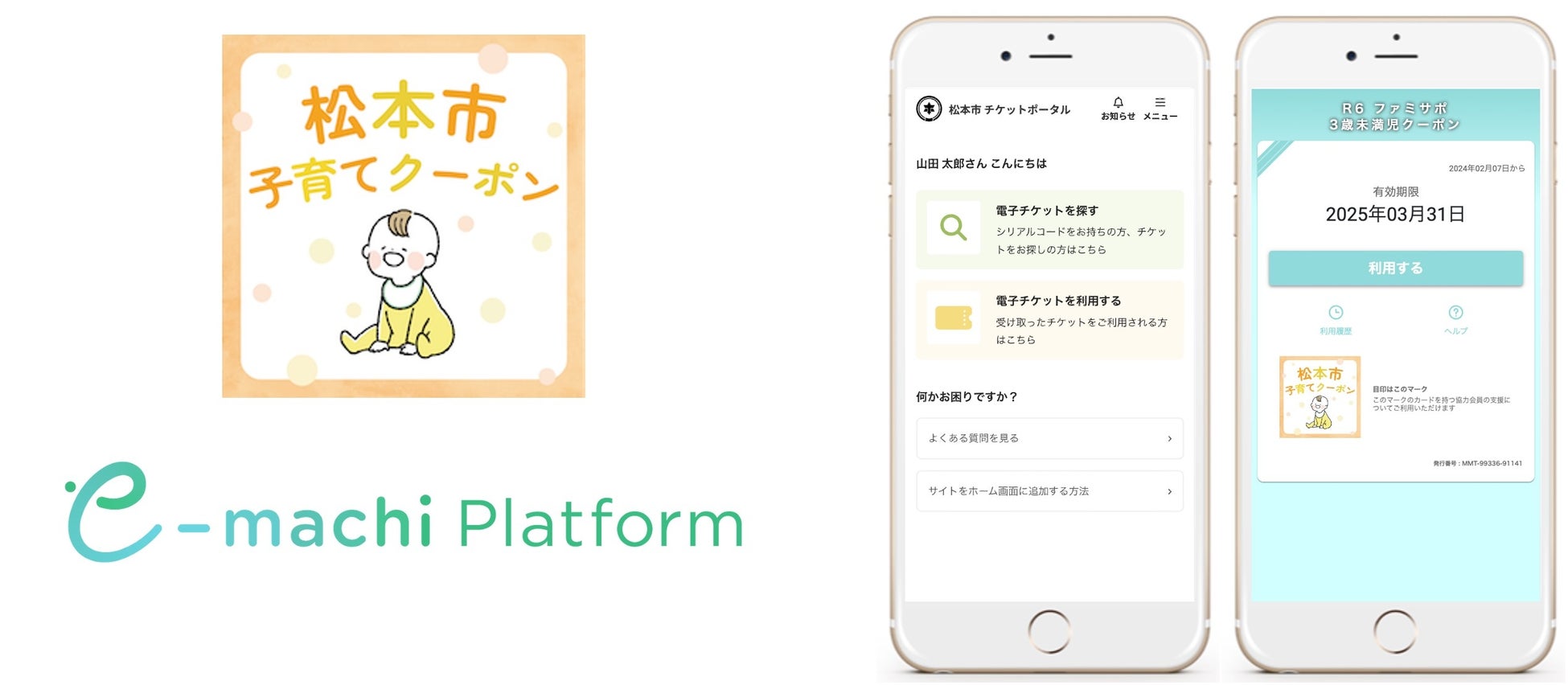 松本市では、市内の子育て世帯の経済的および精神的負担の軽減を目的に、各種子育て支援サービスにお使いいただける子育て支援クーポンを2022年度より配布されています。この度、「松本市子育て支援クーポン」を電子化し流通させる運用基盤として「e街プラットフォーム®」を採用いただき、2024年3月25日(月)申請受付開始分より、電子化を実現いたしました。また、本事業における住民の利便性向上を図るべく、自治体の実施する電子商品券を活用した各種施策を集約することで、住民による電子商品券の一元的な管理を実現するシステム「e街チケットポータル」を、住民専用のポータルサイト「松本市電子チケットポータル」の基盤としてあわせて採用をいただいております。