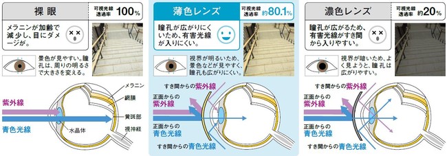 - 薄色レンズは視界が明るいため、瞳孔も拡がりにくい