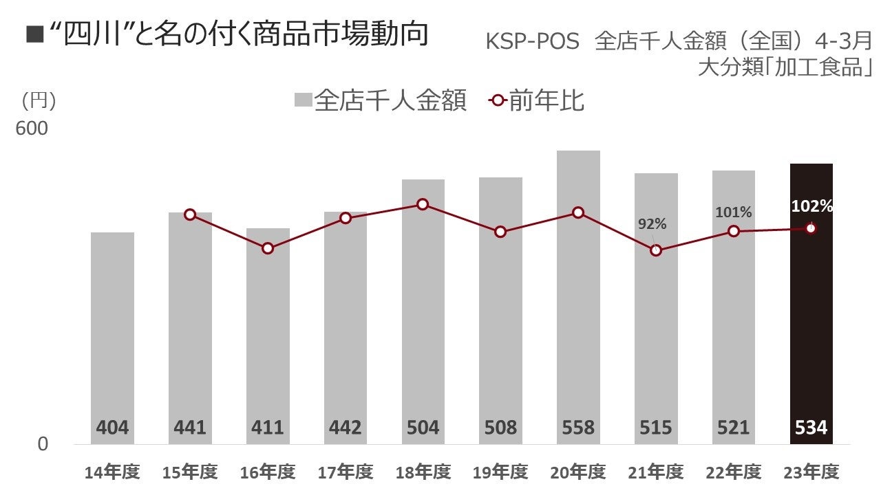 さらに2023年度の“四川”と名の付く商品市場は、前年比102%と伸長しており、中華料理のジャンル・テイストの一つとして確立しています(KSP-POS 全店千人金額(全国)9-2月)。中でも、魚介を美味しく食べられる“花椒”を使用した「麻辣」テイストに着目しました。