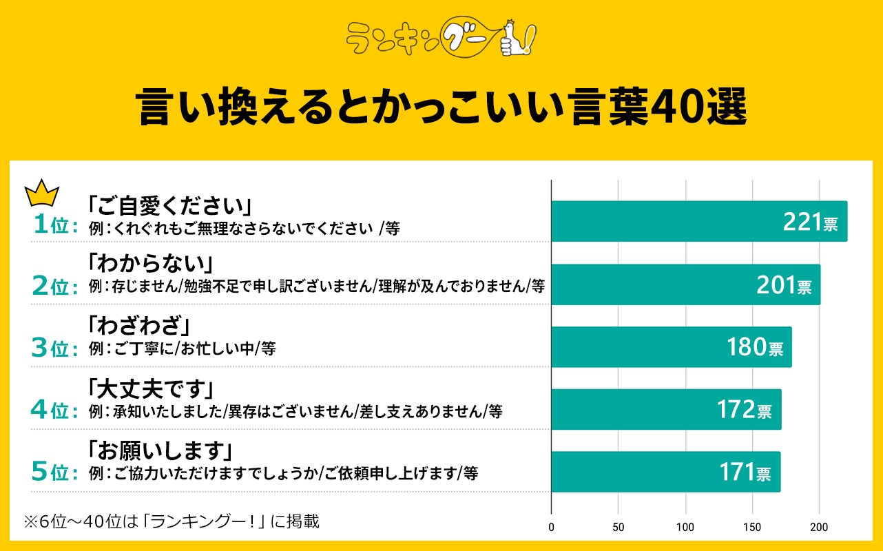 ランキングー!では言い換えるとかっこいい言葉をピックアップし、ランキングを調査。10~50代の男女(性別回答しないを含む)4,926名にアンケートを行い、同率票を含む、TOP40を決定しました。ここではTOP5をご紹介します。