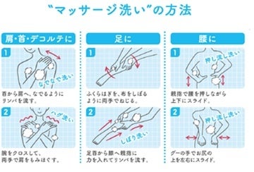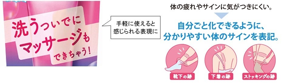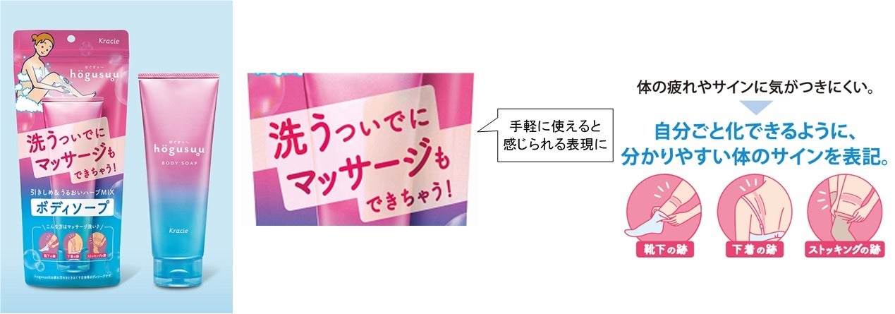 そこで、手軽にマッサージしたいと思っている、より多くのお客様に「hogusuu マッサージボディソープ」を手に取っていただくため、「身体を洗いながらマッサージができる」手軽さと「身体の疲れのサイン」を分かりやすく表記したデザインに変更しました。パッケージの前面には、人気イラストレーターの白根ゆたんぽさんが手掛けた、身体を洗いながらマッサージをしている女性のイラストも可愛らしく描かれています。