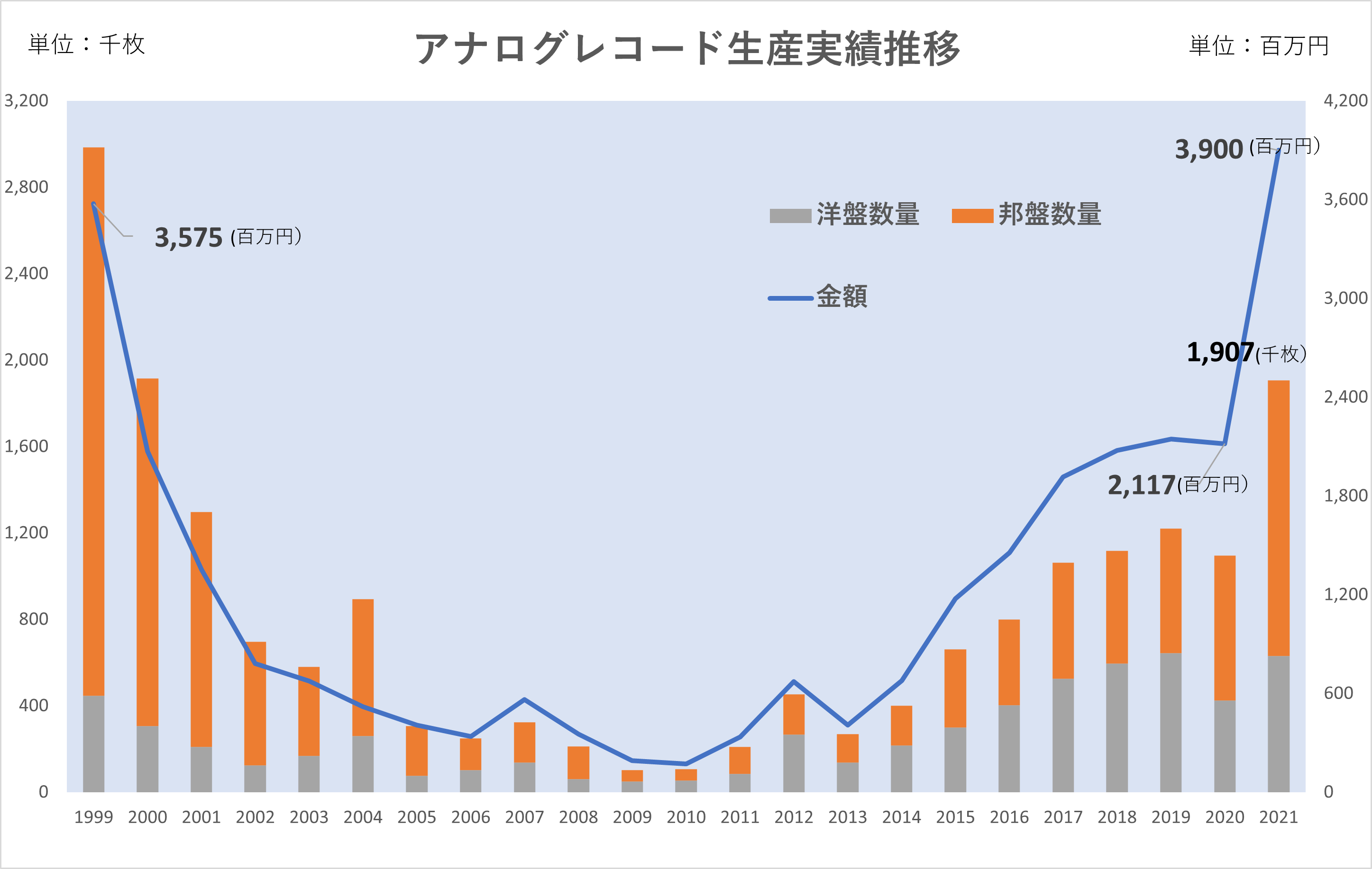 2021年年間の音楽ソフト生産金額は前年比100%の1,936億円、アナログレコードは前年比184%、1999年以来の30億円越え