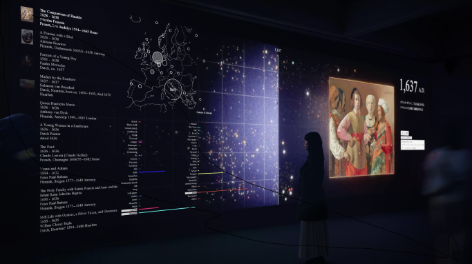 日本経済新聞社の研究開発部署である日経イノベーション・ラボは、ニューヨークのメトロポリタン美術館の協力を得て、同美術館が所蔵する西洋絵画2500点をビジュアライズしたデジタル年表「The European Masterpieces Timeline」を制作しました。様々な時代に書かれた絵画が、いつ、どこで、どのような社会的背景の中で描かれたのかを知ることができます。国立新美術館で2022年5月30日まで開催する「メトロポリタン美術館展 西洋絵画の500年」に展示されています。