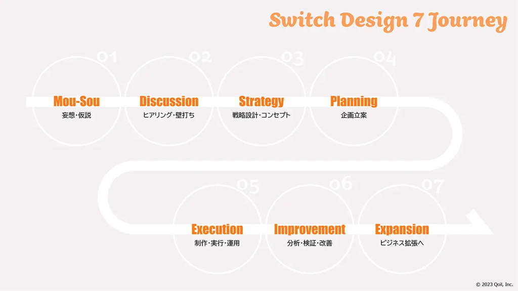 「Switch Design 7 Journey」では、まずQoil社内にてブレストした「妄想・仮説」を提案し、それを糸口に対話・ディスカッションをすることで、より精度を高く課題を抽出、細分化し、解決策の設計や優先順位の決定をします。ブリーフシートではニュアンスまで伝えきれない行間のような部分から、課題解決や課題発見のヒントを導き出す手法を、この機会にぜひ、「おはなし愛」でご体験ください。