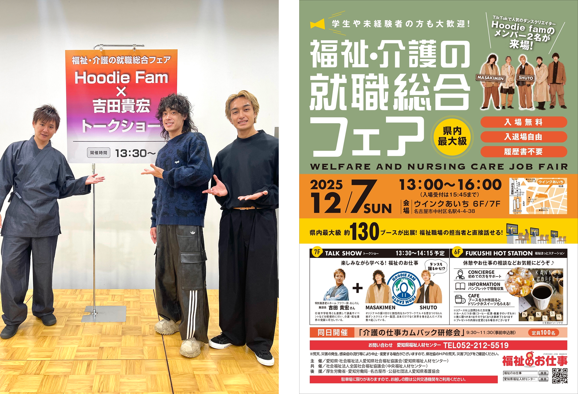 株式会社スターミュージック・エンタテインメント(本社:東京都渋谷区、代表取締役:渡邊祐平、以下「当社」)が運営するStar Creationに所属する人気ダンスクリエイター「Hoodie fam」のメンバー、MASAKIMENと柊斗 が、2025年12月7日(日)にウインクあいち(名古屋市中村区名駅4-4-38)にて開催された「福祉・介護の就職総合フェア」にゲストとして登壇しました。