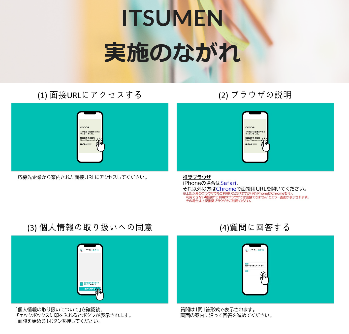 初めての録画面接の際にスムーズに行って頂けるように、また事前に録画するということに不安を覚える応募者様に安心して実施して頂けるように作成いたしました。