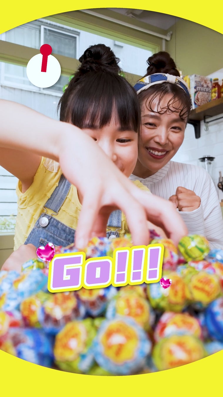 チュッパチャプスminiがたくさん入ったお皿から、片手だけで何本つかめるかに挑戦!結果はもちろん、思わず笑顔になってしまうリアクションにも注目。