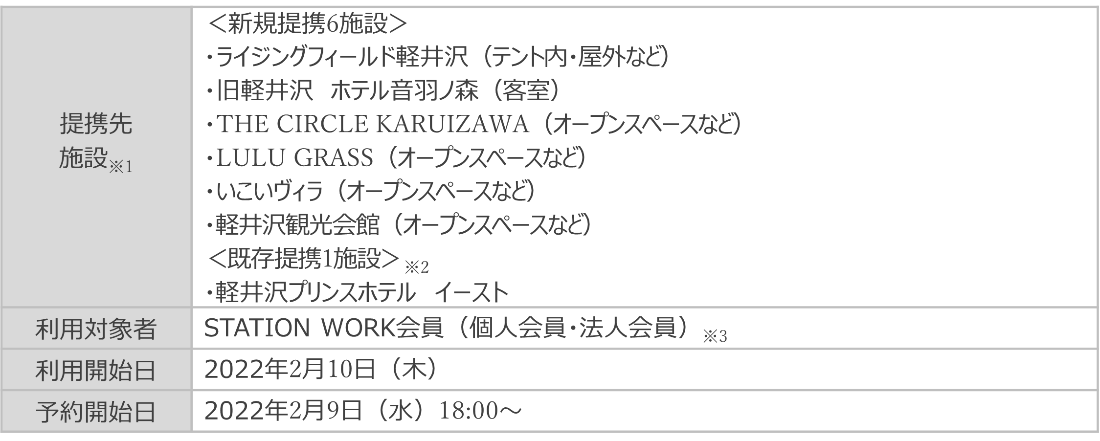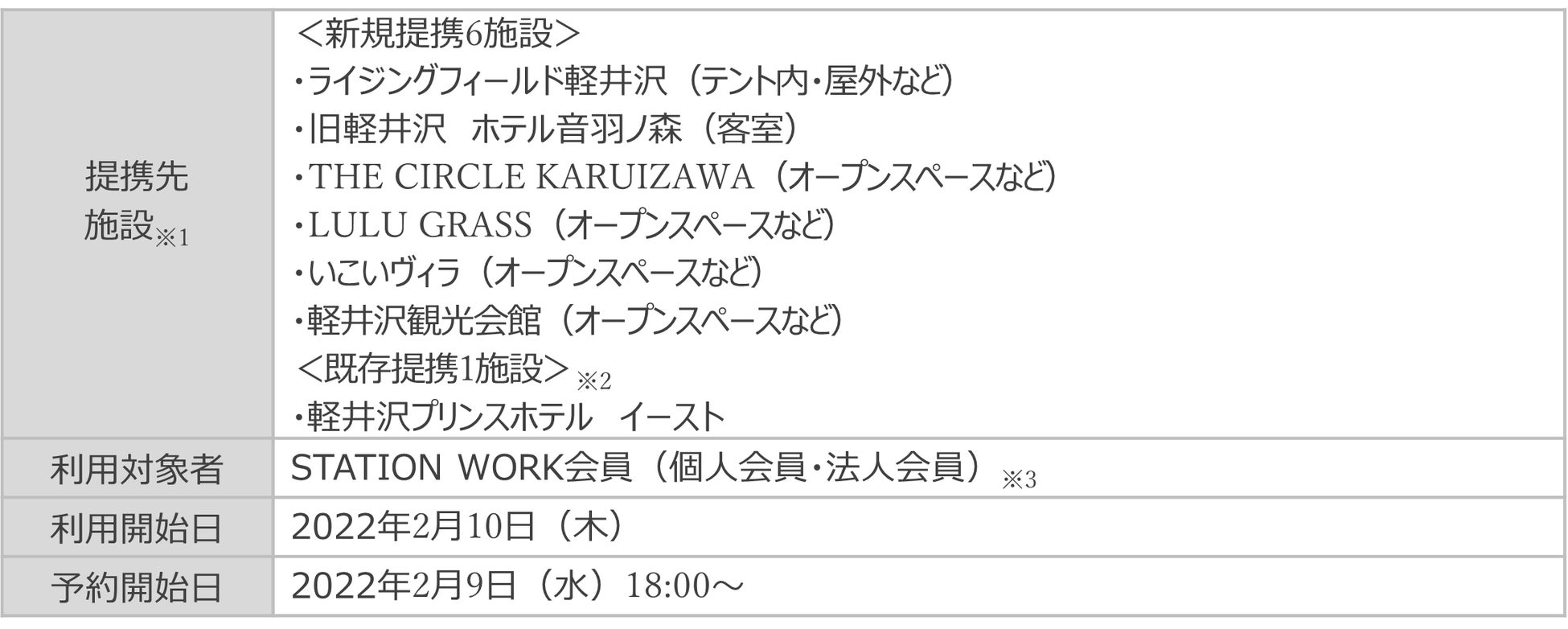 | ○東日本旅客鉄道株式会社(以下、「JR東日本」)と、一般社団法人軽井沢観光協会(以下、「観光協会」)は、軽井沢エリアでの快適なテレワーク環境の提供とワ―ケーションの推進を目的とした提携を開始します。 ○観光協会との提携により、2022年2月10日(木)以降STATION WORK会員は軽井沢リゾートテレワーク協会の会員施設のうち、新たに6拠点の利用が可能になります。執務環境が整っている施設で快適なテレワークをご体験ください。 ○STATION WORKで予約し、対象施設をご利用いただいた方の中から、抽選で20名さまにJRE POINT5,000ポイントをプレゼントするキャンペーンを実施します。 ○JR東日本は、今後もリゾートテレワークやワーケーションなど新たなライフスタイルを提案していきます。 |