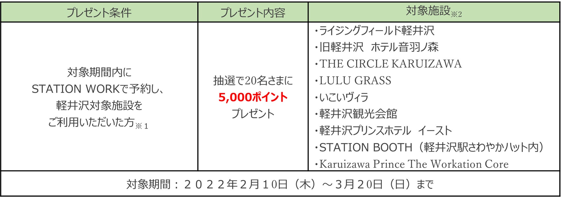 STATION WORKで予約し、対象施設を対象期間中にご利用いただいた方の中から、抽選で20名さまにJRE POINT5,000ポイントをプレゼントするキャンペーンを実施します。