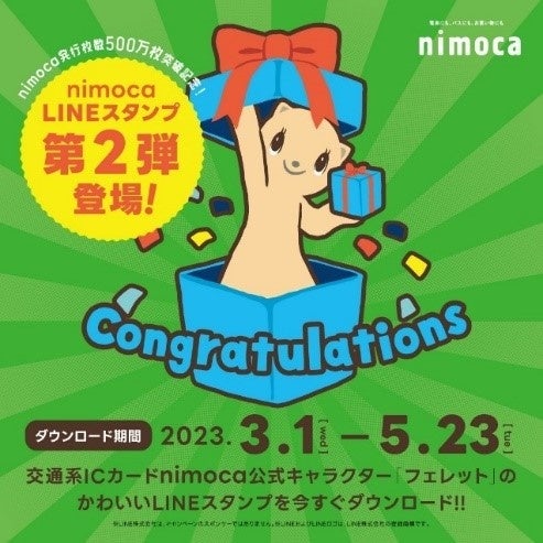 株式会社ニモカ(所在地:福岡県福岡市、代表取締役社長:田端敦)が発行する交通系ICカード『nimoca』は、おかげさまで累計発行枚数500万枚を突破することができました。これを記念して、2023年3月1日(水)から5月23日(火)までの期間中、nimocaオリジナルキャラクターフェレットのLINEスタンプを無料配信いたします!また、「nimoca LINE公式アカウント」からnimocaカードを登録・エントリーした方の中から抽選で1,000名さまに「LINEポイント2,000ポイント」をプレゼントいたします!