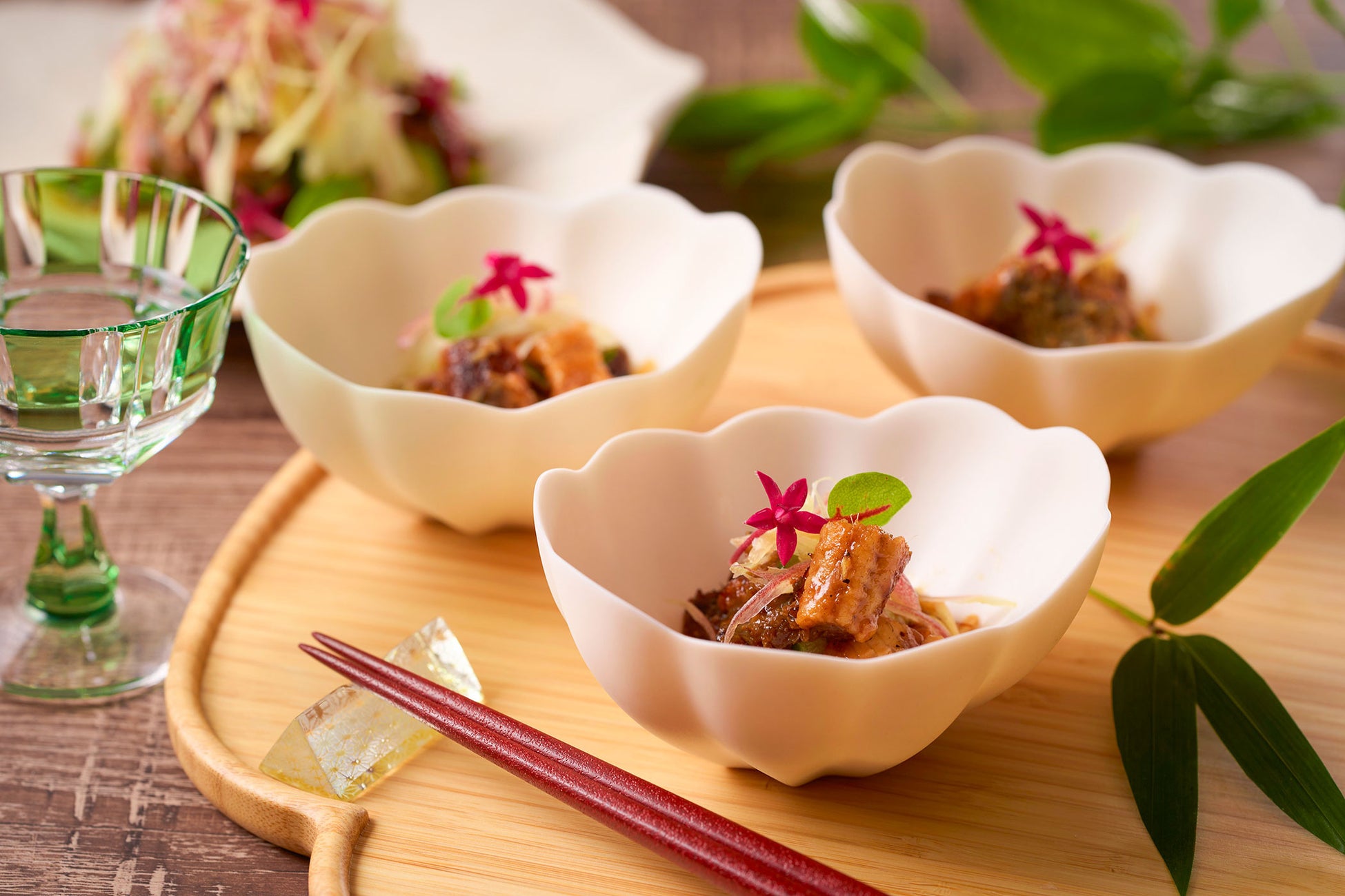 夏に食べたい食材、うなぎは「洋風うざく」でご用意いたしました。バルサミコ酢と土佐酢できりっと仕上げた前菜をお楽しみください。