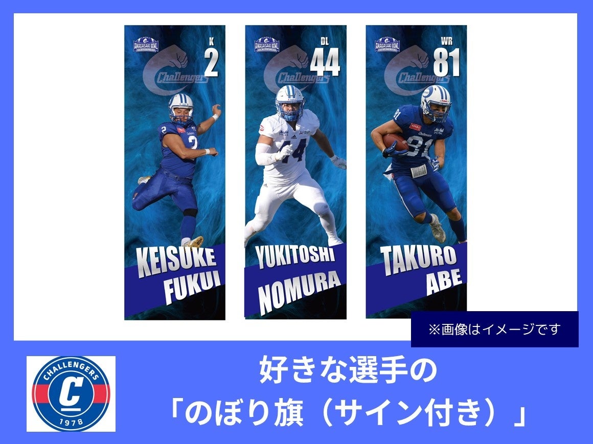 お好きな選手をデザインした「のぼり旗」を作成し、尼崎ボウルの際に掲出いたします。掲出後、選んでいただいた選手1名のサインを入れてお届けします。イベント終了後、「チャレンジャーズに贈呈」or「ご自宅へ配送」をご選択可能です。