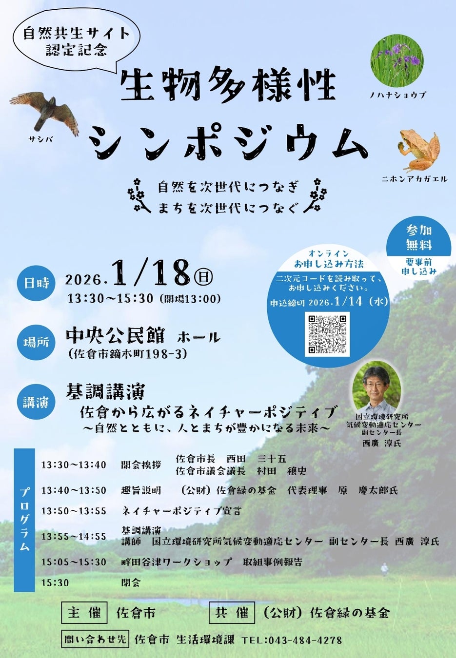 来年1月18日、千葉県佐倉市で『生物多様性シンポジウム~自然を次世代につなぎ、まちを次世代につなぐ~』を開催します。