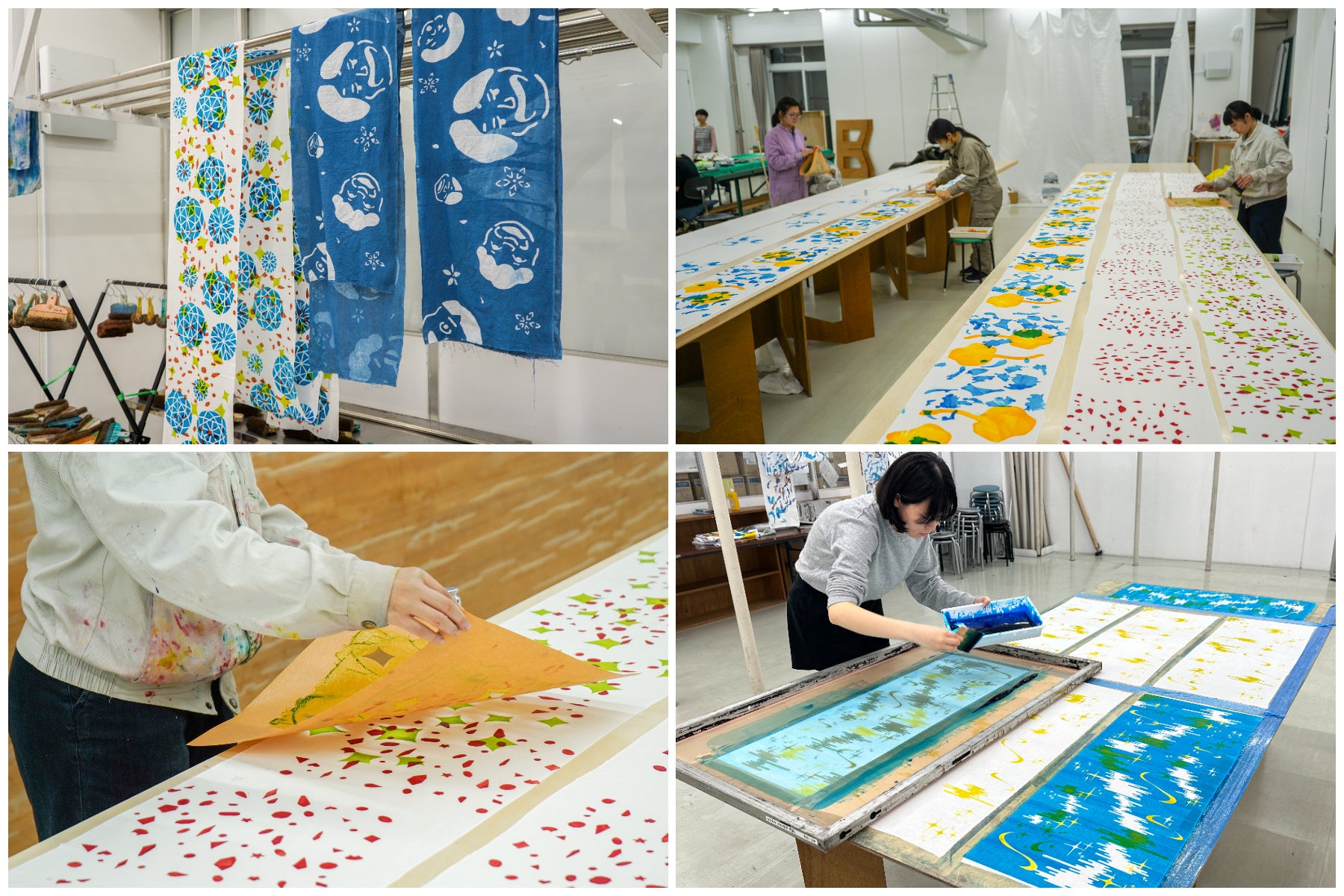 シルクスクリーン、藍染め、ケイコロール等の多様な染色技法を用い、各々が手作業で染めあげました。