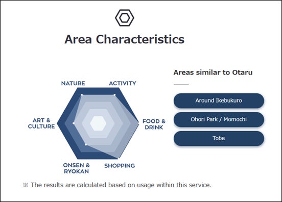この機能では、エリアごとの特徴が、レーダーチャートにてひと目でわかり、ユーザーの旅先選びをサポートします。レーダーチャートで表現することで、文章や写真だけでは伝えきれなかったその地域の特徴を直感的に把握できます。
