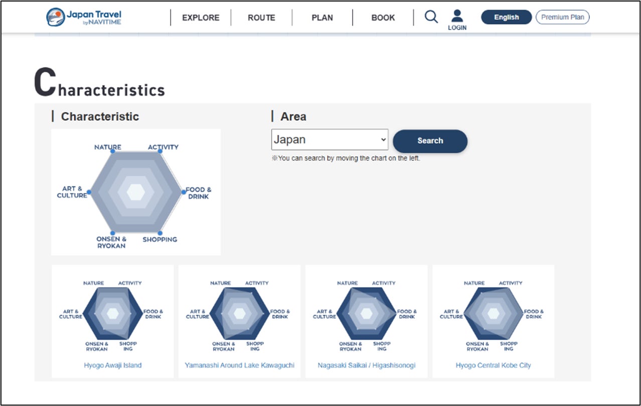 『Japan Travel by NAVITIME』および『NAVITIME Travel』Web・PC画面のトップページの「特徴(characteristics)」にて、全国または各地域を選択した上で、レーダーチャートの各優先度を5段階で設定し、検索すると、条件にマッチするエリアが最大4つ提案されます。スマホで操作する場合は、エリアを選択し、気になる特徴を1つ選択することで、マッチするエリアが表示されます。