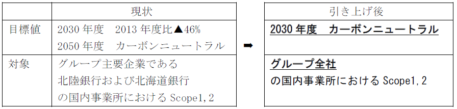 ほくほくフィナンシャルグループ(取締役社長 中澤 宏、以下ほくほくFG)は、脱炭素化をより一層促進していくため自社グループにおけるCO2排出量削減目標を引き上げましたので、お知らせいたします。