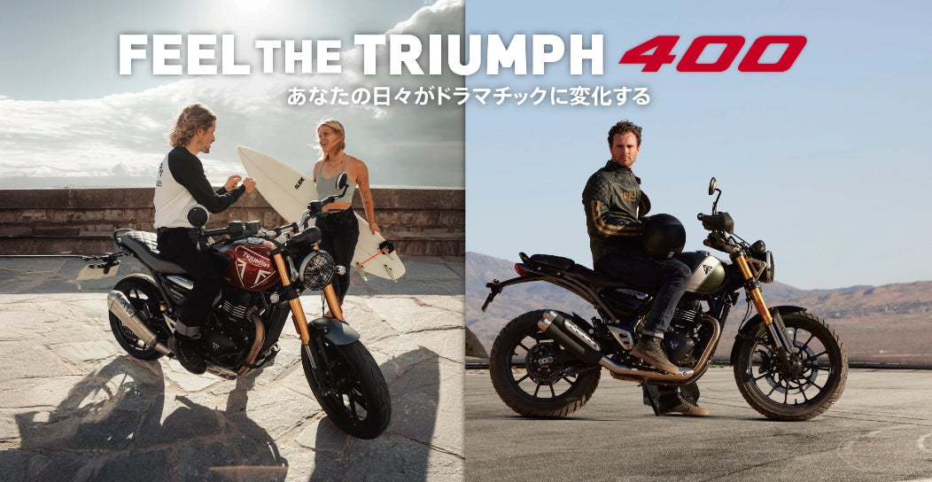 トライアンフモーターサイクルズジャパン株式会社(代表取締役社長:大貫 陽介、東京都港区)は、2025年4月11日(金)から5月30日(金)までの期間中、トライアンフの400ccモデル「SPEED 400」と「SCRAMBLER 400 X」を対象とした試乗キャンペーン「FEEL THE TRIUMPH 400」を開催することをお知らせします。