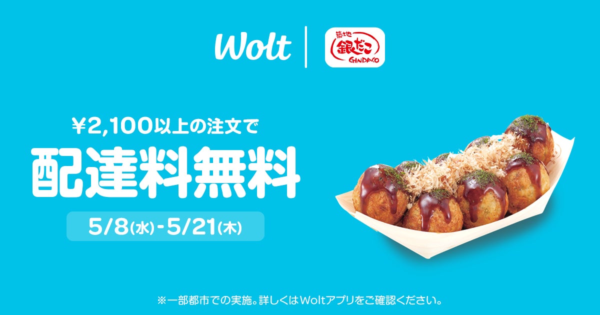 日頃よりWoltのデリバリーサービスをご利用頂いているお客様へ感謝を込めて、5/8(水)~ 5/21(火) までの14日間、全国の築地銀だこ 「Wolt」 加盟・サービス対応店舗(一部店舗を除く)にて、『配達料無料キャンペーン』※ を実施いたします!