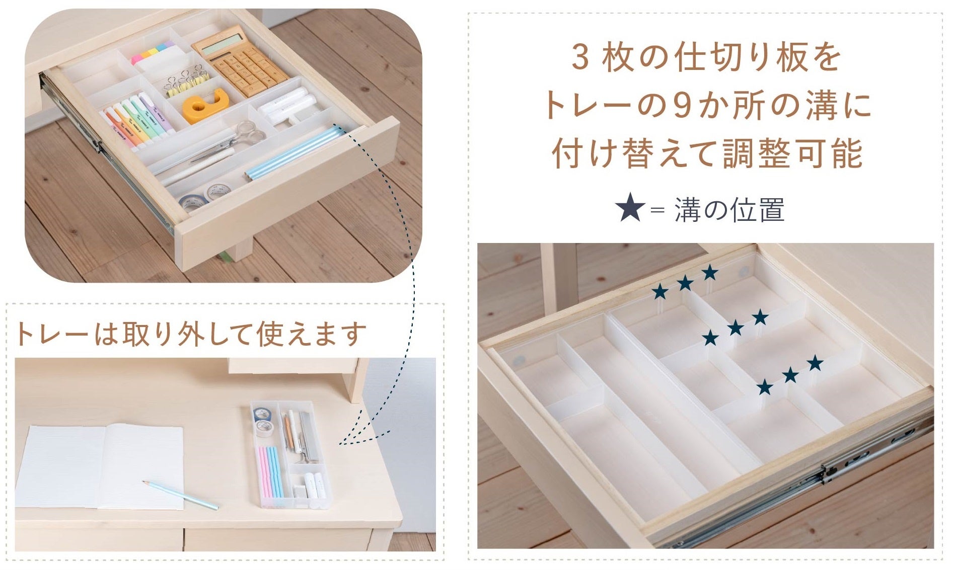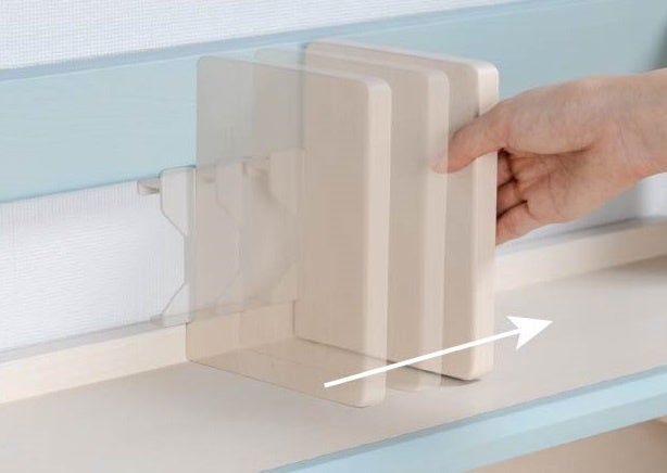 上棚に付属の仕切り板は、取り外しもでき自由に調節可能。左右にスライドできるので本やノートの量に合わせてすっきり収納でき、教科書や参考書が増えても安心です。