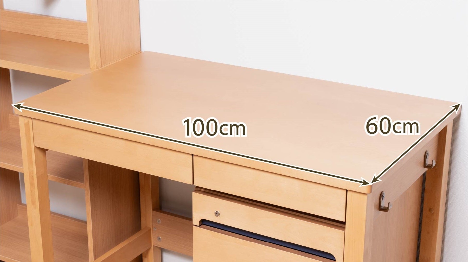デスク天板は幅100㎝、奥行60㎝。デスク天板上に書棚がないので、圧迫感なく広々とご使用いただけます。デスクライトは卓上タイプか天板奥にクランプ式ライトも取り付け可能です。