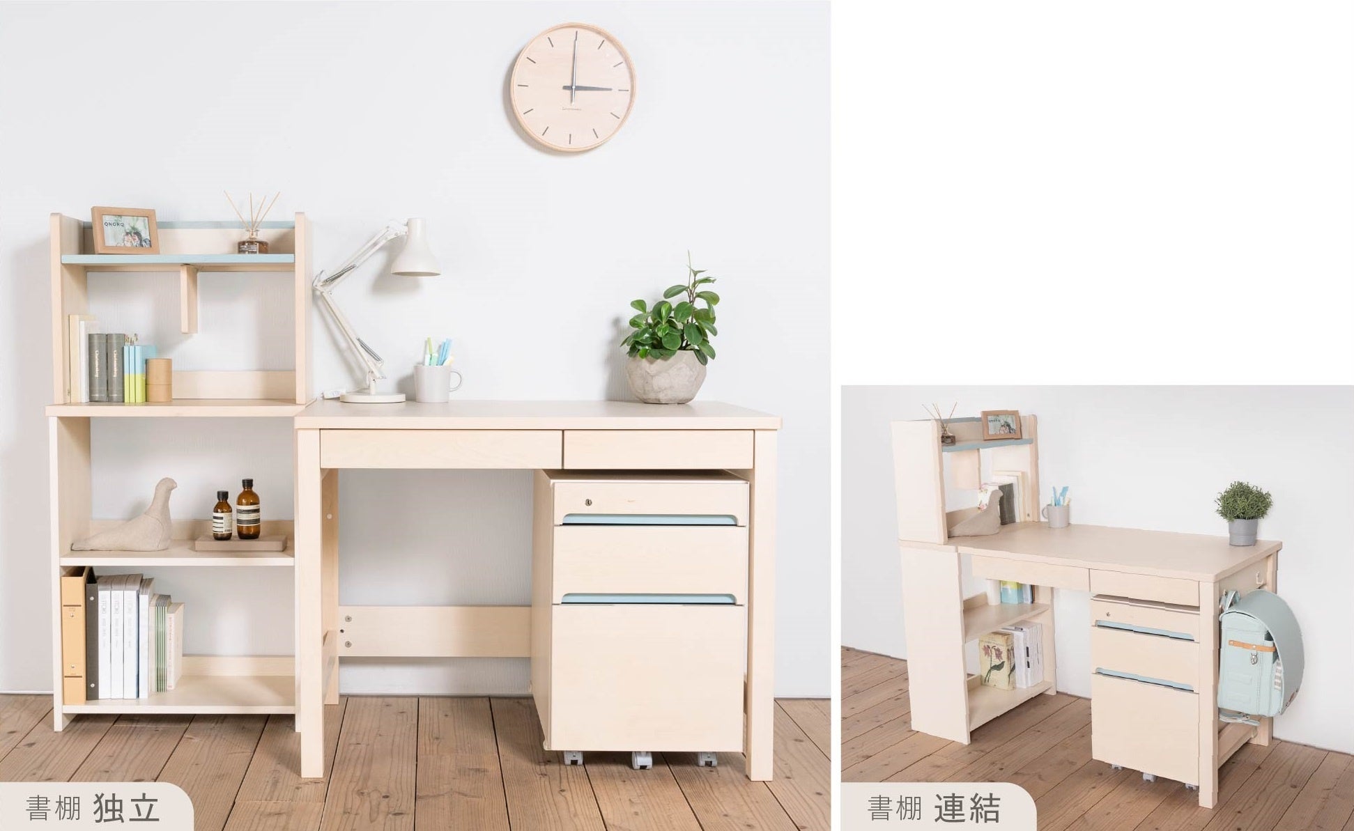 デスク・書棚・ワゴンがそれぞれ独立しているため、配置の工夫で限られた部屋のスペースを有効活用できます。書棚はデスクと連結することができます。