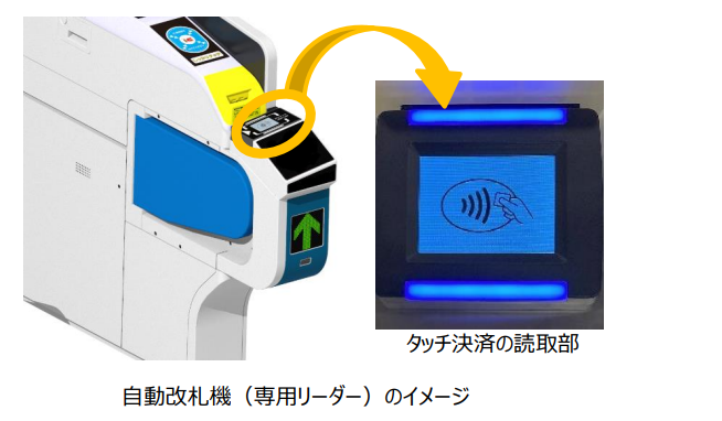 クレジットカードやデビットカード等のタッチ決済による乗車では、ICカードへのチャージやきっぷの購入が不要となり、お客様がお持ちのタッチ決済対応のカード(クレジット・デビット・プリペイド)や同カードが設定されたスマートフォン等を、自動改札機に新たに設置する専用リーダーにタッチすることで改札を通過できます。