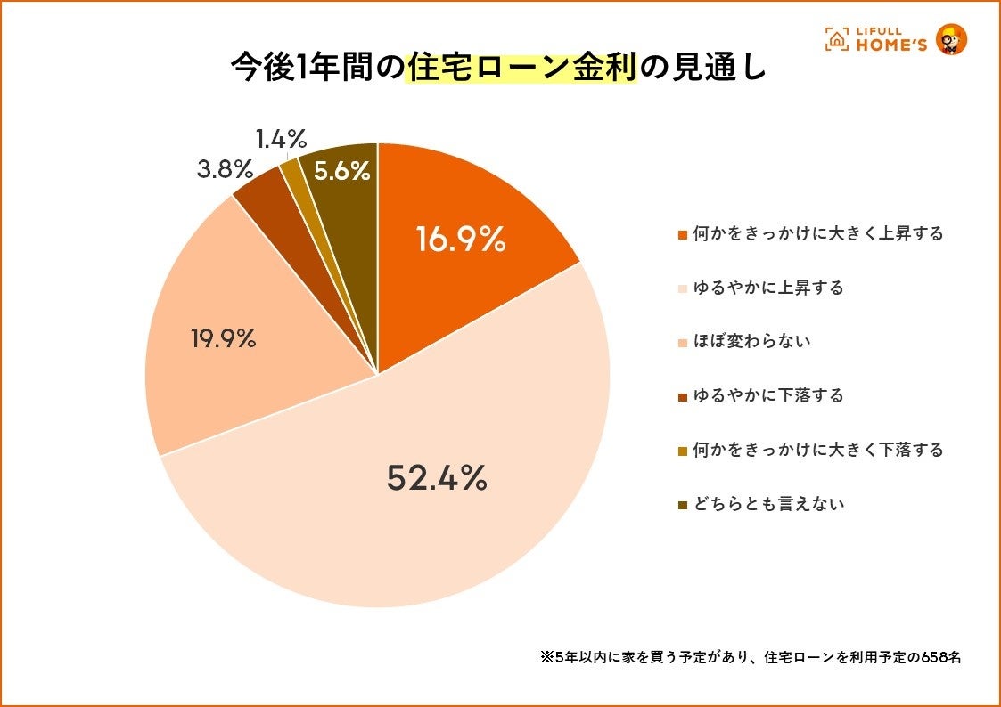 今後1年間の住宅ローンの見通しについて、最も多かった回答は「ゆるやかに上昇する」(52.4%)で、「何かをきっかけに大きく上昇する」(16.9%)と合わせると69.3%が「上昇」を予測していることが見えました。