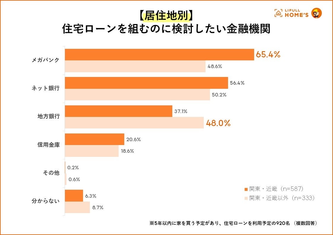 住宅ローンを組むのに検討したい金融機関を居住地別で見たところ、関東・近畿では「メガバンク」(65.4%)が最も多く、続いて「ネット銀行」(56.4%)、「地方銀行」は半数を下回りました。一方で関東・近畿以外では「ネット銀行」(50.2%)、「メガバンク」(48.6%)、「地方銀行」(48.0%)が2%ほどの差で拮抗しました。