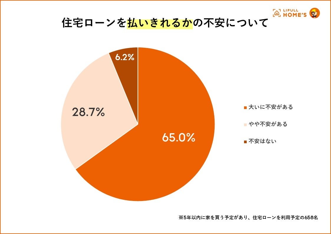 住宅ローンの支払いについては65.0%が「大いに不安がある」、28.7%が「やや不安がある」と回答し、大多数が多かれ少なかれ不安を抱いていることが分かりました。