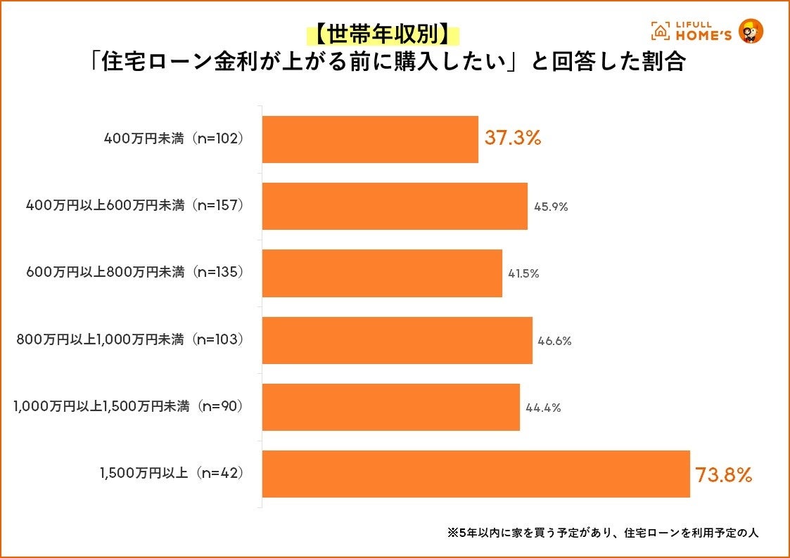 世帯年収「1,500万円以上」だと「住宅ローン金利が上がる前に買いたい」の回答が7割超に