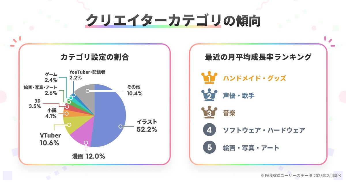 しかし、直近2024年8月〜2025年2月の新規登録クリエイター数を比較すると、「ハンドメイド・グッズ」「声優・歌手」「音楽」「ソフトウェア・ハードウェア」「絵画・写真・アート」といったカテゴリの月平均成長率が高く、急成長しています。