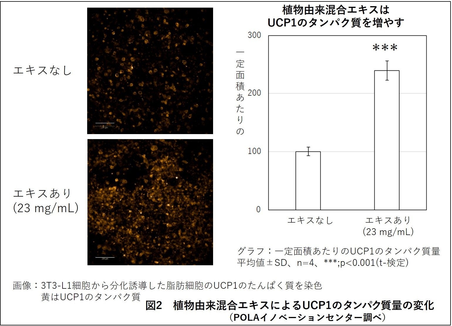 株式会社ポーラ(本社:東京都品川区、代表取締役社長:及川美紀)は、脂肪細胞の中性脂肪を減らす植物由来混合エキス(ラビットアイブルーベリー(葉・茎エキス)・ダイダイエキス・緑茶エキスの組み合わせ)を発見しました。脂肪を熱に変換する機能を持つUCP1 ※のタンパク質量が増加していることにより、脂肪の分解が亢進されていることが示唆されました。この知見は、ポーラから発売される製品に応用されます。